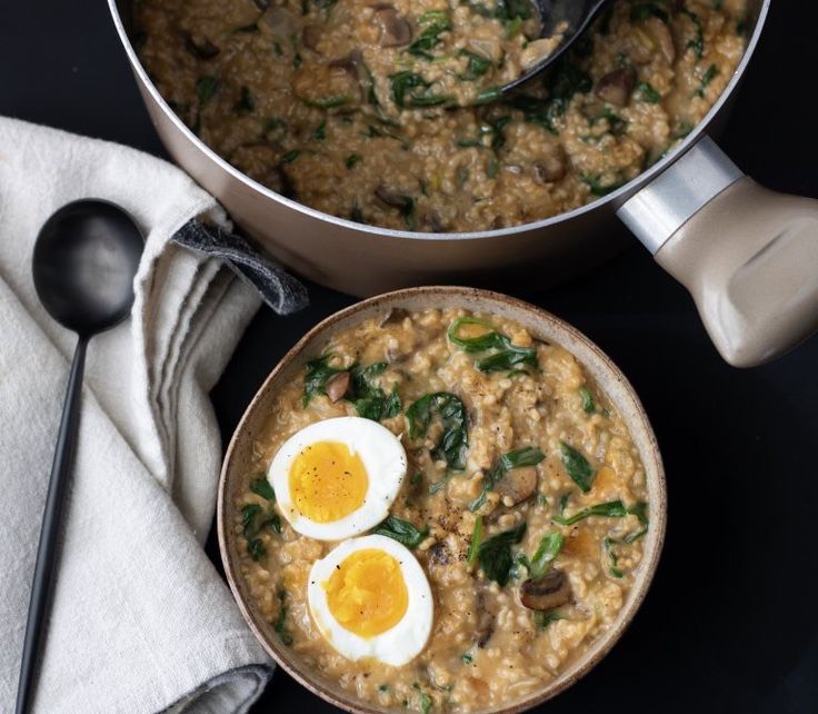 Kamu bisa memasak oat dengan air kaldu agar memberi cita rasa gurih. Tambahkan satu butir telur, segenggam jamur shiitake dan segenggam bayam sambil mengaduk oat agar matang merata. Sesuaikan rasa dengan memberi tambahan lada dan totole. Sajikan dengan topping telur rebus.