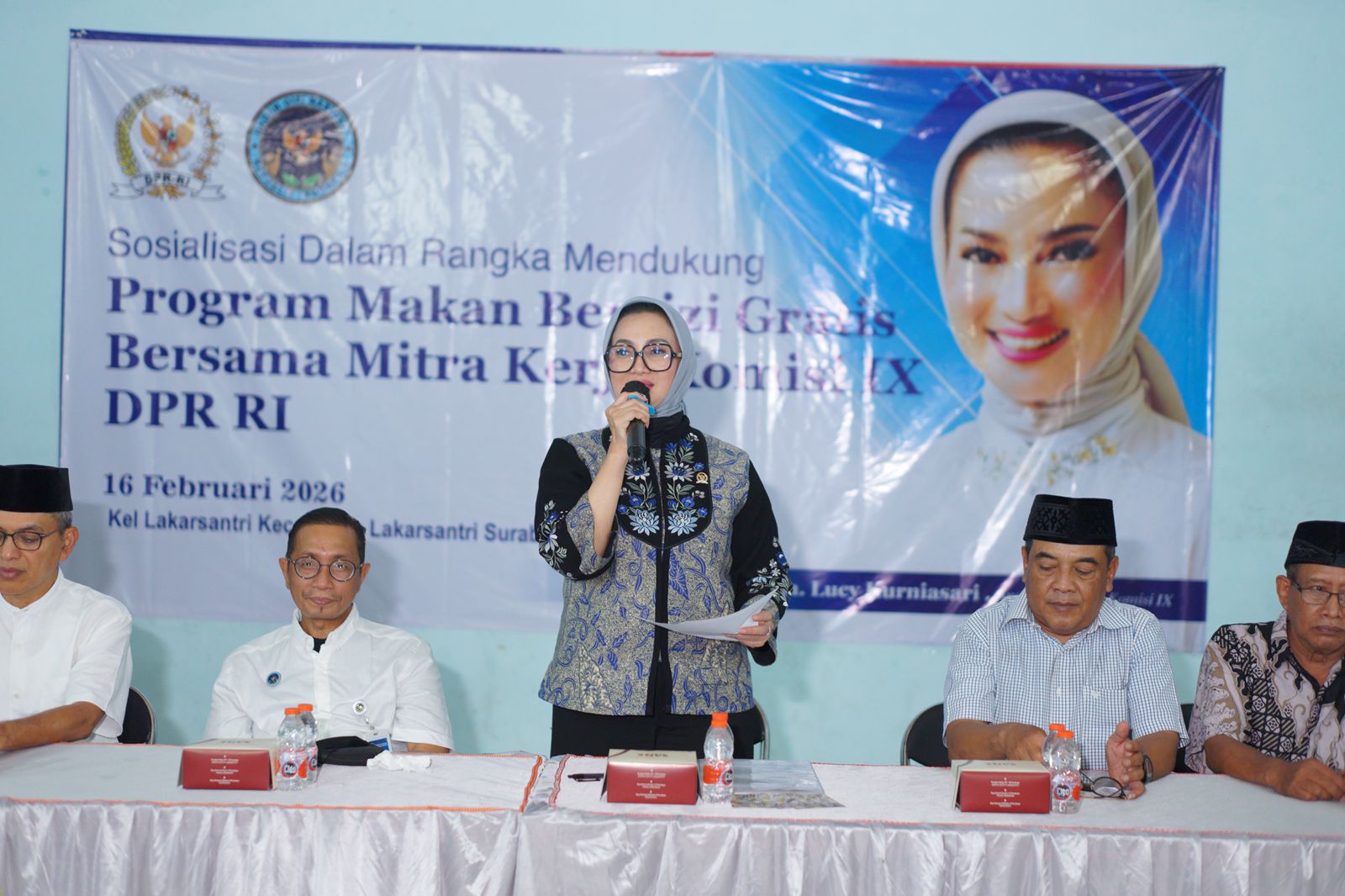Sosialisasi Program Makan Bergizi Gratis (MBG) bersama mitra kerja digelar di Halaman Balai RW 2, Lakarsantri, Surabaya pada Senin, (16/2). Kegiatan ini menghadirkan Anggota Komisi IX DPR RI, Lucy Kurniasari, yang memberikan pemaparan langsung kepada masyarakat mengenai pentingnya peningkatan gizi sebagai fondasi pembangunan sumber daya manusia.