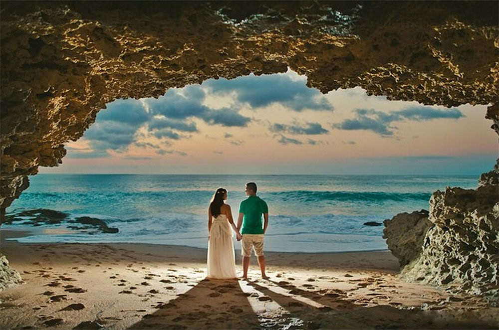 Berada di balik dinding batu kapur membuat pemandangan dari pantai ini semakin indah. Dengan hamparan pasir putih dan laut biru memesona mempercantik foto prewedding.