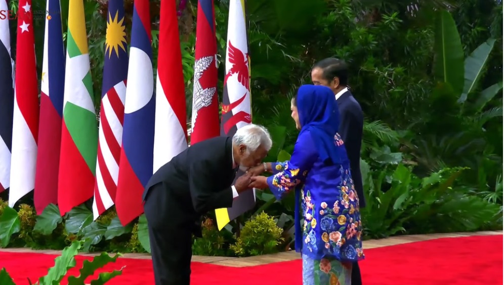 Presiden Jokowi dan Ibu Iriana Jokowi menyambut kedatangan Perdana Menteri Timor Leste Xanana Gusmao di KTT ASEAN ke-43. Xanana Gusmao menyalami Ibu Iriana Jokowi dan kemudian mencium tangan Ibu Negara. Xanana Gusmao selanjutnya berjabat tangan dengan Presiden Jokowi.