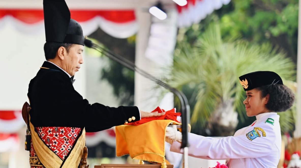 Lilly Indriani Suparman Wenda, anggota Pasukan Pengibar Bendera Pusaka (Paskibraka) asal Provinsi Papua Pegunungan selanjutnya membawa bendera Merah Putih untuk kemudian dikibarkan.